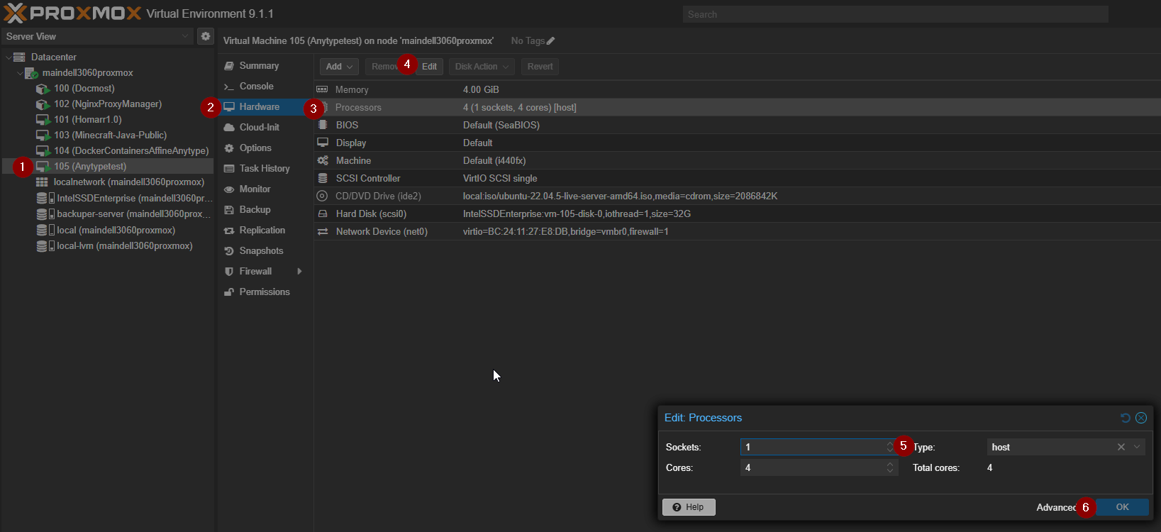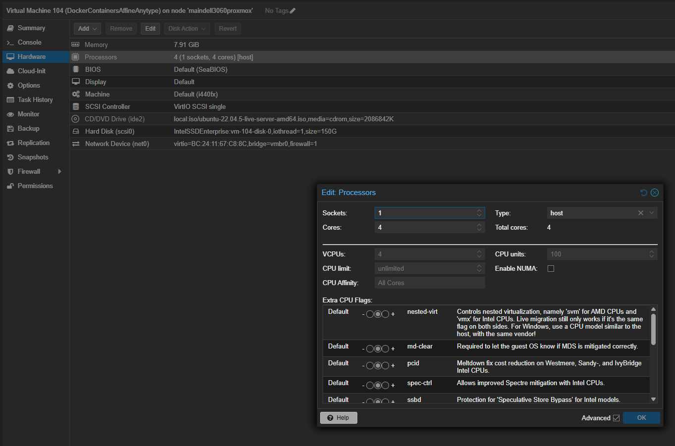 To fix this, within Proxmox (or find the same setting within your virtual environment) go to Your VM/Hardware Tab/ CPU (click edit)/then set type: to host