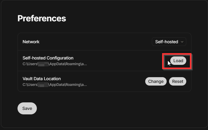 - Select Load from Self-hosted Configuration, and find your client.yml file (which we saved to our desktop by default if you copied and pasted the commands from earlier).