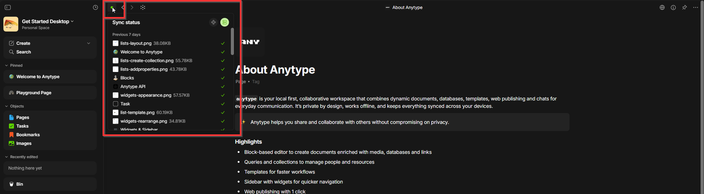 That is it, you are now inside of your AnyType Instance, with auto server syncing and backups. You can check the status of your file backups and if you are connected to your server thanks to the green dot icon after you login: