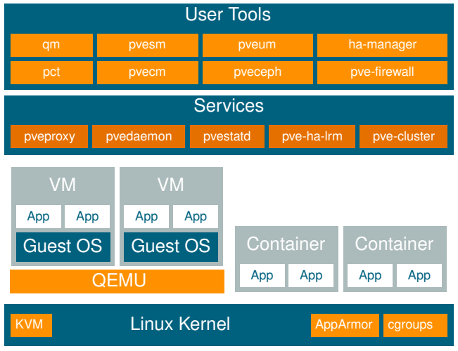Here is a picture that explains how Proxmox as a software technology is setup. The bottom of the picture is the root Linux Debian OS, and the top of the image are the Proxmox services/tools you as the Proxmox admin will use to administer the environment.