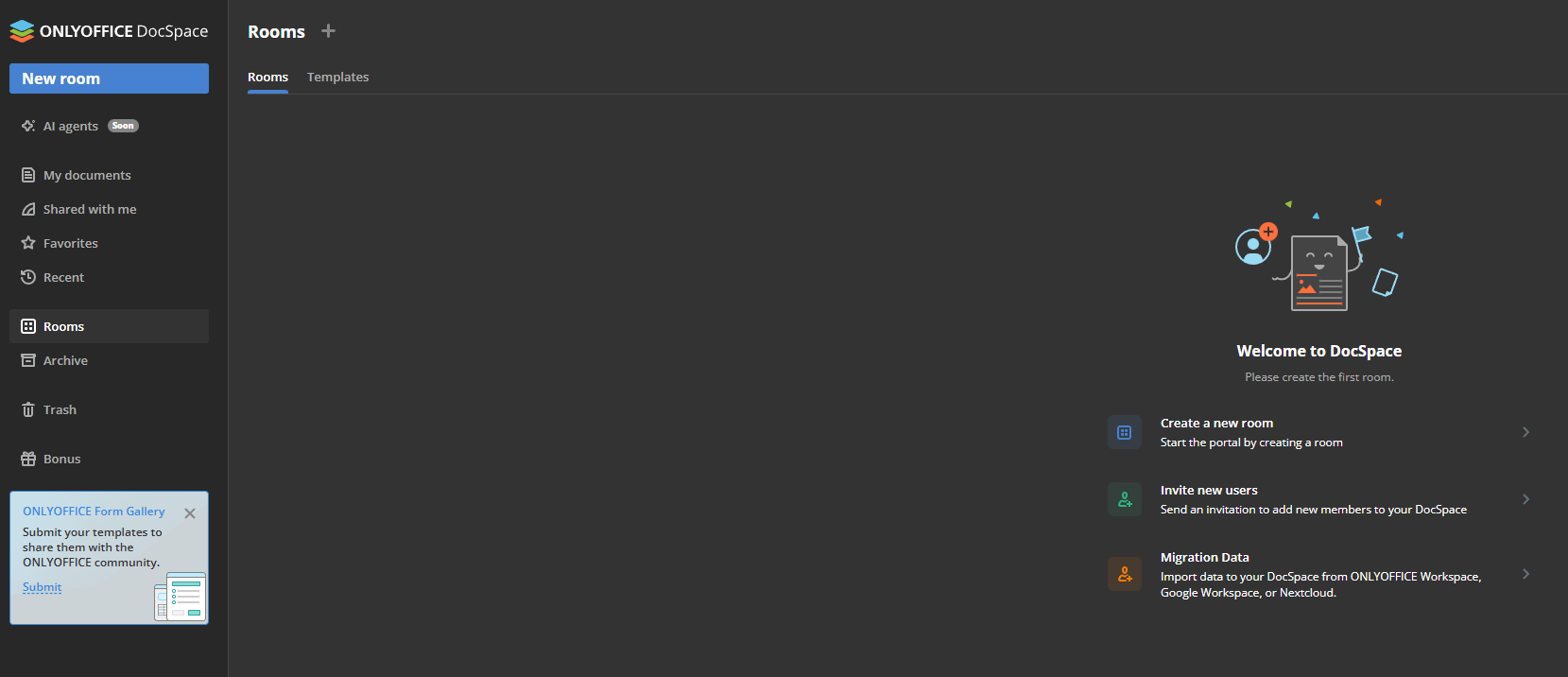 Then go into your browser and type the IP address of the VM you installed OnlyOffice on, you will be presented with a page that looks like the image below. Go ahea and create a room for the task you want to do, specific tasks like teamwork, form-filling, or public sharing.