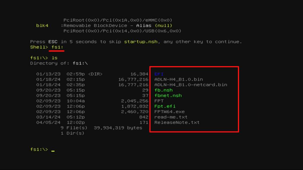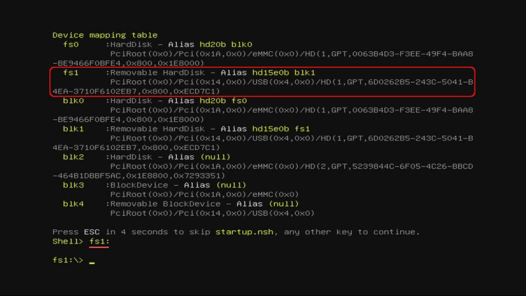 - Enter “fs1:” on your keyboard to select your USB drive.