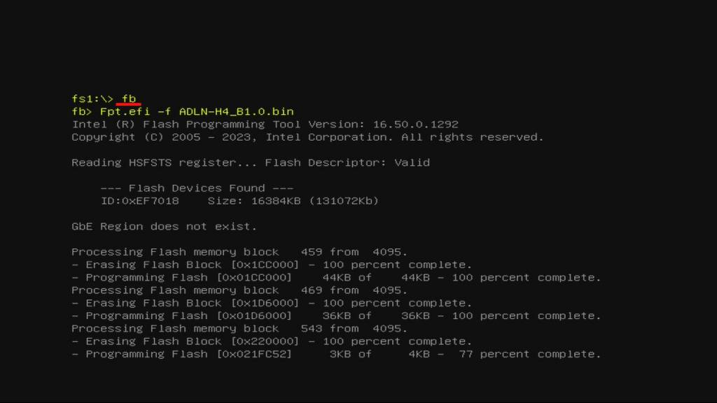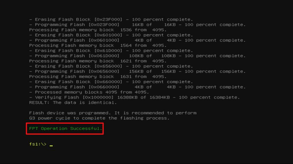 - After a clean install, you will see “FPT Operation Successful” at the end, you can remove the USB device, pull the power cord, wait a couple seconds, plug it back in, and power your device on with the power button located on the back.