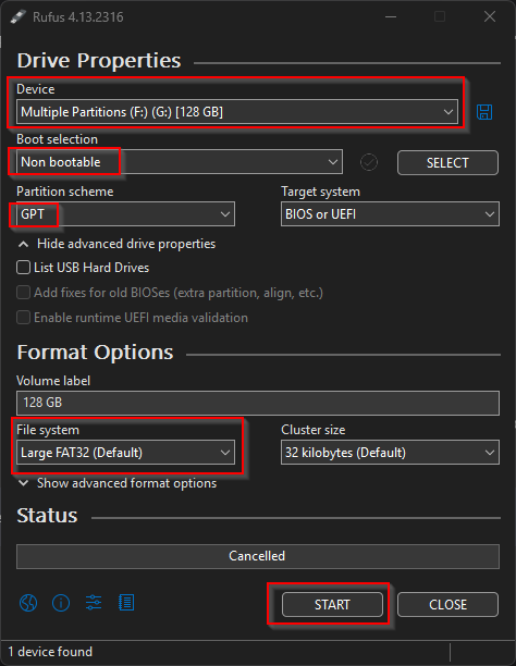 After you know the file is safe to install, format your USB device using rufus with the following settings: