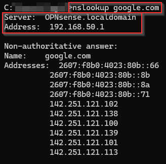 We have also confirmed DHCP is working by seeing a list of hosts in the previous step, we can also ensure Unbound DNS is still working by performing the following command in our devices terminal/command line: