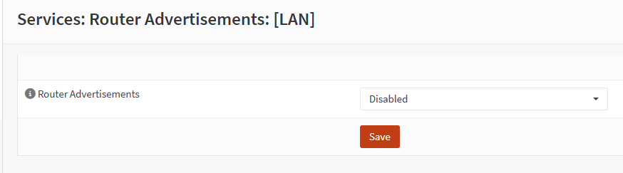 Under services > router advertisements > LAN, set the router advertisements to disabled and click save.