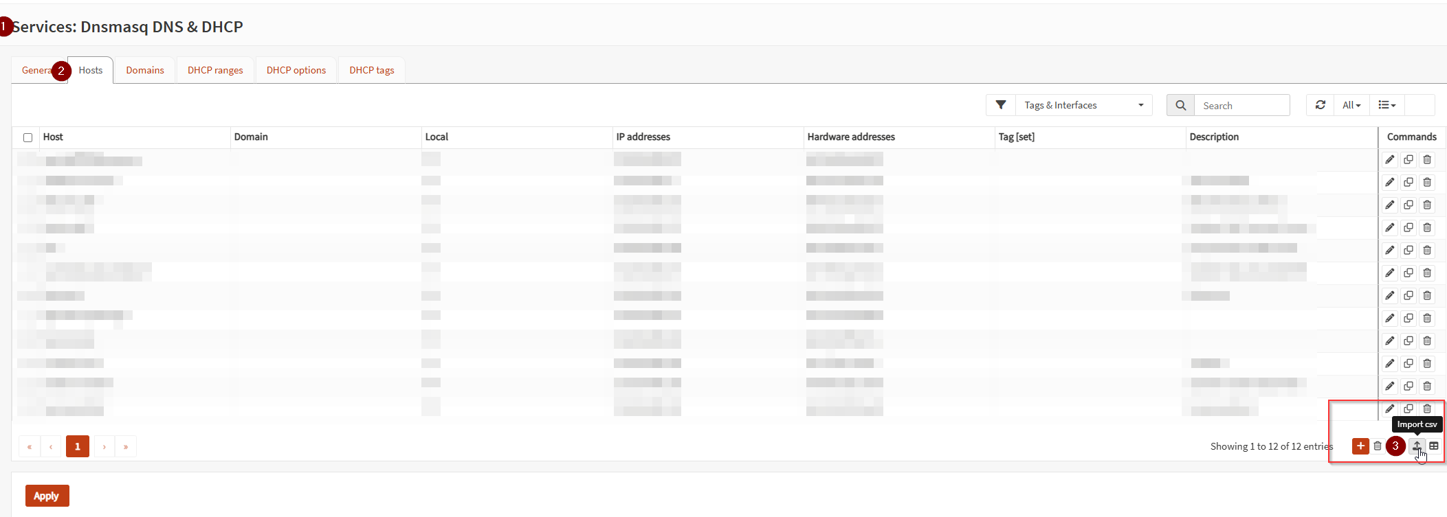 Now move over to the Hosts tab and we can upload our static ISC DHCP mappings here from the earlier step where we downloaded the .csv file.